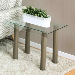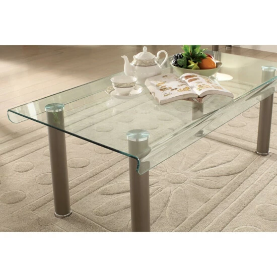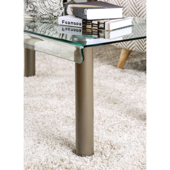 Modernize your living space with this stylish, contemporary two-piece accent table set from Furniture of America. The curved glass tops and powder coated tube legs of this coffee table and end table will instantly add charm and personality to your living room decor. Each piece features a smooth, sturdy 8mm glass top for a modern look with exceptional strength and durability. The shimmering champagne finish of the legs are a chic contrast against the shiny chrome accents for a dynamic design with tons of style. A matching sofa table is also available, sold separately, to bring your living space together in style.