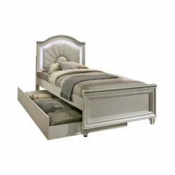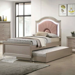 Fit for a modern princess, this rose gold bed and trundle is a dramatic addition. It boasts a pleated headboard with LED lighting that makes a perfect nightlight. Mirrored trim adds sparkling appeal while the textured panel footboard is a lovely finishing touch.