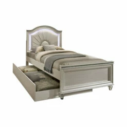 Outfit your child’s bedroom style and function with the Ving three-piece bedroom set from Furniture of America. The set includes one youth bed in your choice of full or twin sizes and two nightstands built from wood and faux leather for durability and easy care. The bed boasts a panel headboard with a dramatic camelback and nightstands offer curvy aprons that add a romantic touch. The traditional white finish complements any color bedding, no matter how often it changes, and provides style that grows with your child. The padded leatherette headboard includes an LED reading lamp for convenient reading in bed. The nightstands are designed with roomy felt-lined drawers for secure storage of everything from electronics to personal treasures.