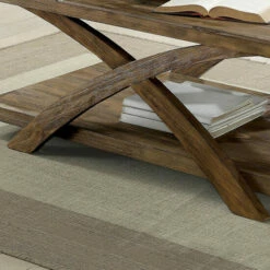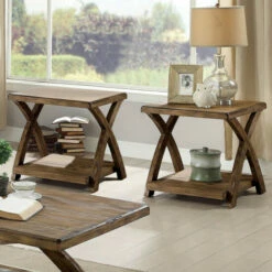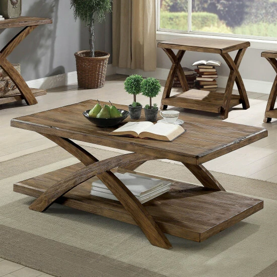 Charming crisscross shapes and rich wood grain accents make this three-piece coffee table set exude richness and character. An antique light oak finish adds just the right touch of warmth to the striking silhouette of each piece. Lower shelves provide a convenient stash spot for everyday essentials. The set comes complete with one coffee table and two end tables to round out a living room seating area in style.