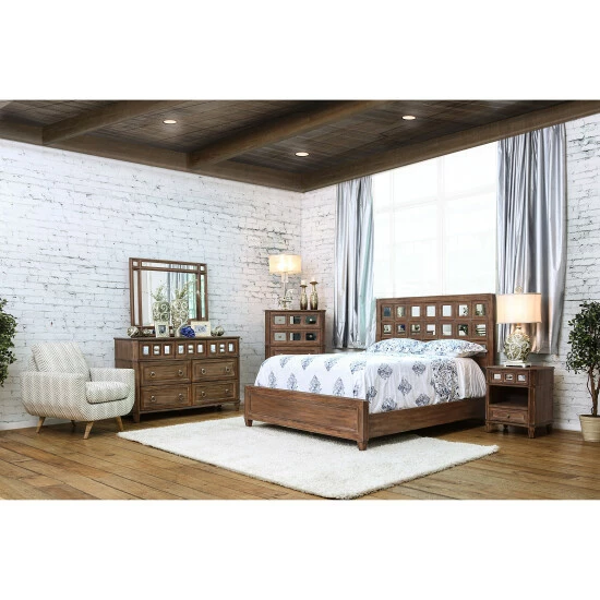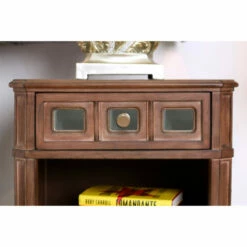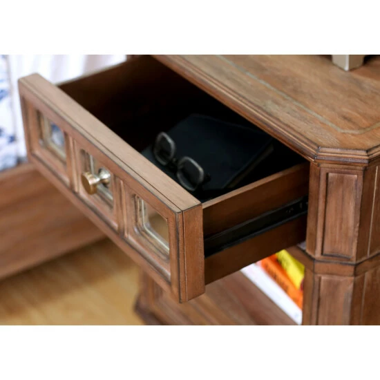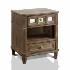 Rustic design gets a chic makeover with this Wahu Oak Solid Wood Nightstand. This transitional style stand showcases a lightly distressed oak finish and mirrored inserts in the top drawer for an interesting design element. This piece is constructed of mahogany wood and boasts a felt lined top drawer and ball bearing full extension metal glides for smooth drawer operation. Features include two drawers for convenient storage separated by an open shelf perfect to keep your books and bedside necessities close at hand. The molded trim and tapered legs add to the architectural beauty of the piece for a look that radiates rustic warmth. Explore the entire collection, available separately, to customize and build the bedroom suite of your dreams.