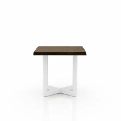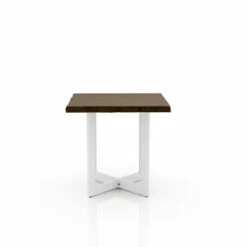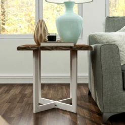 With a two-tone design for drama and a live edge tabletop for appealing visual texture, this gorgeous, oak and white end table pulls a living room together in style. Crafted of iron and rubber wood with an angular, geometric base, this transitional table is impeccably crafted for lasting quality and style.