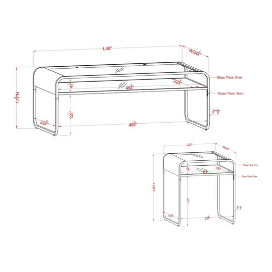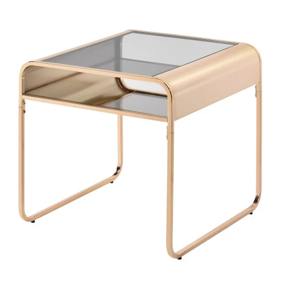 Light and lovely, this contemporary two-piece living room table set adds an airy ambiance to your living space. Ideal for the modern minimalist, this set boasts a warm gold finish over open sides and graceful curves panels. Tabletops on the coffee and end table are crafted from clear tempered glass that gives a peek at the mirrored shelf underneath. Add small decor on lower shelf while maintaining plenty of space on the tabletop for larger items like vases and table lamps.