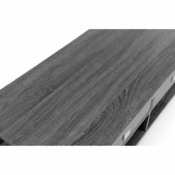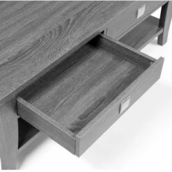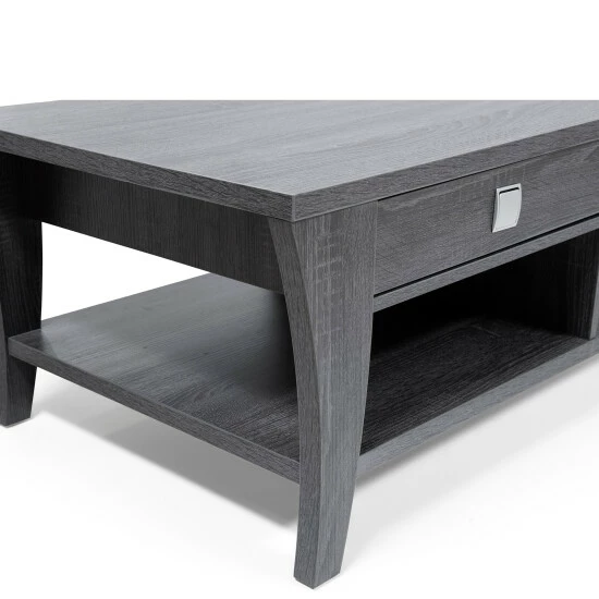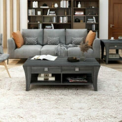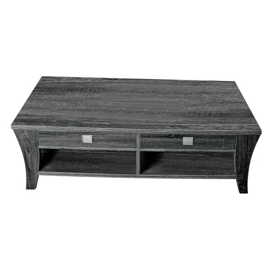 Bring a bit of rustic style to your living space with the Werc coffee table from Furniture of America. The subtly curved wood and veneer frame features a grey finish, woodgrain accents, and silver-finished metal knobs. Two drawers and two open shelves offer easy organization.