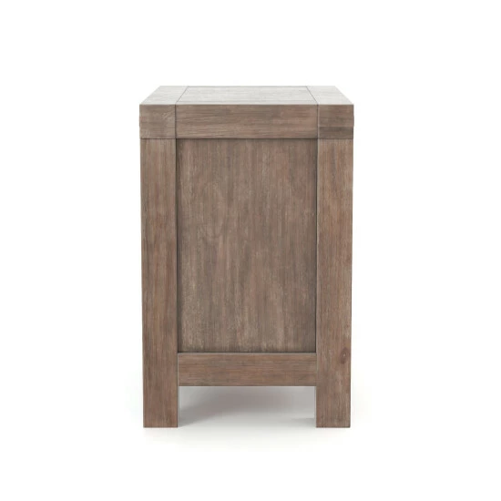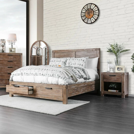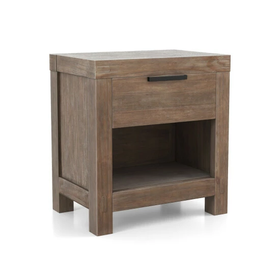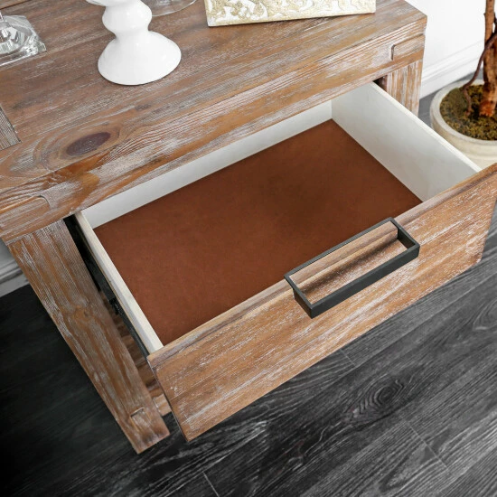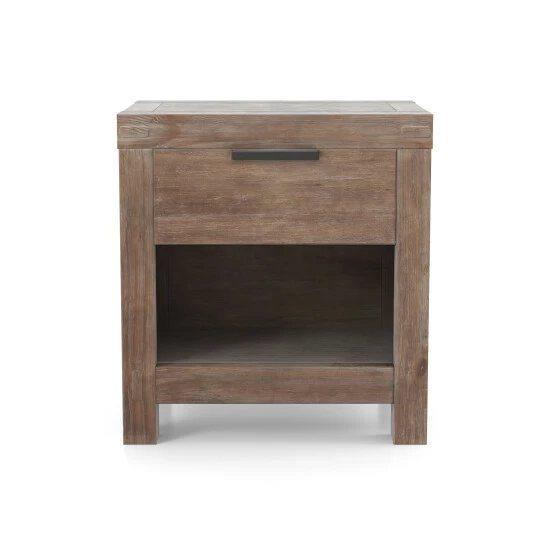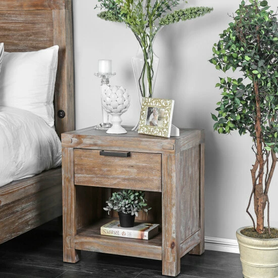 Beautifully rustic charm highlights a custom casual bedroom when the Werr wood rustic oak wood single-drawer nightstand anchors a bed in style. This nightstand from Furniture of America is a tempting option for laid-back, earth-inspired décor, delivering a delightful aesthetic with plenty of bonuses. Embrace a rustic weathered light oak finish that infuses warmth around an entire room. A solid wood and wood veneer build with English dovetail construction ensures quality, as a felt-lined drawer protects valuables and fragile items. Ball bearing drawer glides make it easy to open and close. An open bottom shelf compartment increases storage and display space. A minimalist metal drawer pull placed high on its single drawer offers a sweet design element.