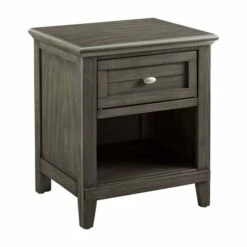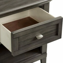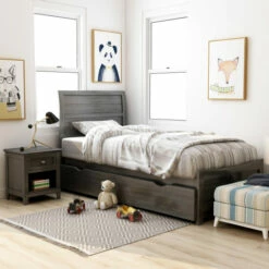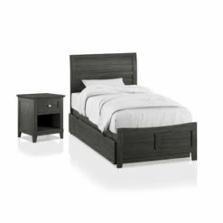 With an elegant, deep grey wood grain finish, this three-piece bedroom set lends a casual style to a transitional master suite. Complete with a trundle panel bed with a curved headboard and footboard, as well as a single nightstand, this set features a plank panel design that lends a nautical or country vibe. In addition, the nightstand offers an open lower shelf and a convenient felt-lined top drawer for fine jewelry and delicates, adorned with a silvery oval knob.