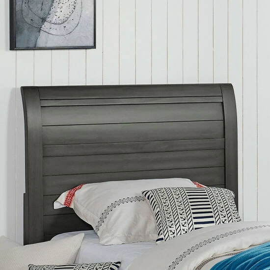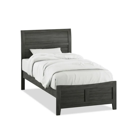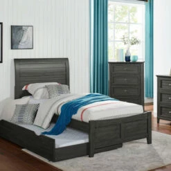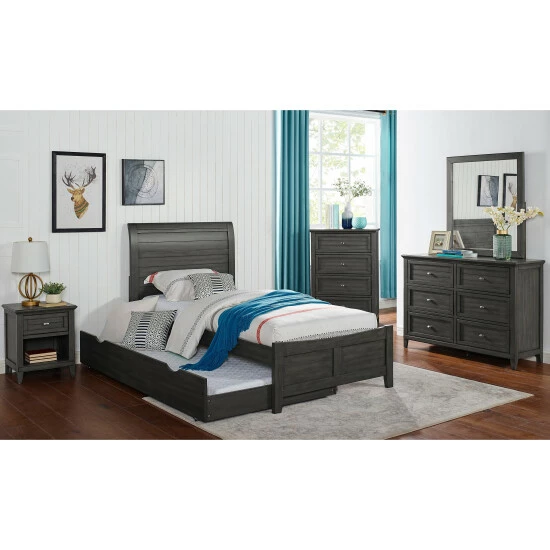 With its visual appeal and contemporary elements, this stylish Furniture of America Wese collection bed frame delivers precisely what your child needs in a bedroom. Perfect for a transitional style bedroom, this bed frame features a gently curved headboard and sleek plank details for a cohesive look with plenty of appeal. Available in either a full size or twin size, the platform is supported and elevated by tapered legs. A dark grey woodgrain finish lends itself to a variety of existing color palettes. In addition, this Wese bed also has a space-saving pull-out trundle available, great for your child’s sleepover guests.