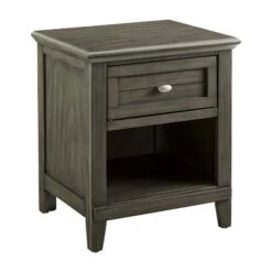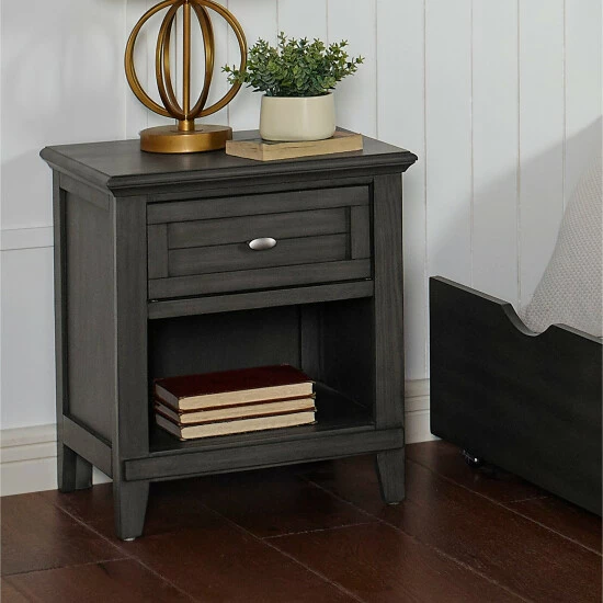 The simple design of this transitional style nightstand gets the job done in style. The single storage drawer moves smoothly along the metal center glide for ease of use. The attractive beveled top surface accentuates the country-inspired plank front of the drawer, while a gleaming metal drawer handle adds a modern touch. The felt lining inside the drawer safely holds delicate bedside items, while an open bottom shelf gives you plenty of storage space to spare. Crafted of solid wood and wood veneers in a lovely, muted grey finish, its beautiful and durable design is made to last for years of use.