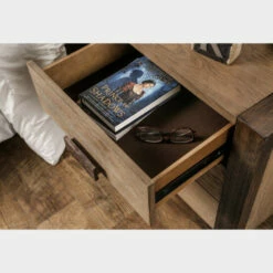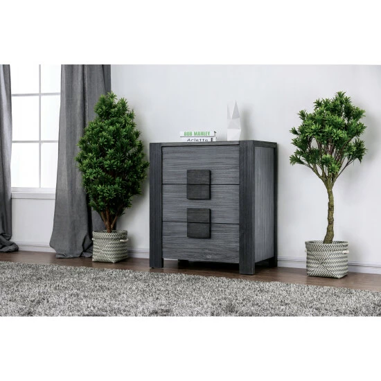 A unique structure that offers plenty of storage space for clothing, this stylish and roomy nightstand offers storage and functionality. Created by Furniture of America for the Wima collection, this is a spacious nightstand with two roomy drawers on metal glides, which makes a magnificent home for your necessities. The tabletop gives ample space to display decor and your other favorite items. This piece is finished in your choice of grey or a rustic natural tone for aesthetic flair, perfectly suiting industrial, rustic, or country style bedroom themes. Its constructed of wood and veneer and sits upon block posts for stability. ..