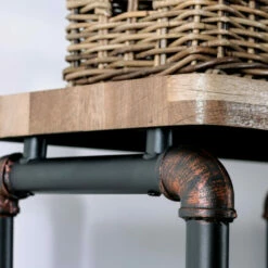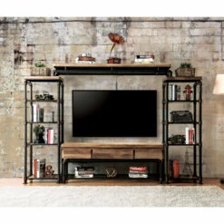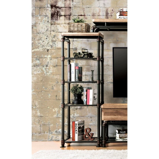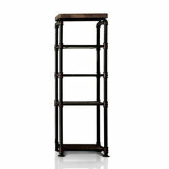 Update your home with this urban pier shelf from Furniture of America. Crafted in a two tone design featuring different materials, this shelf features a pipe-inspired frame in antique black with hand-painted copper accents, which contrasts nicely with the natural tone finish of the drawers and shelves.