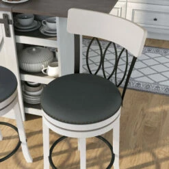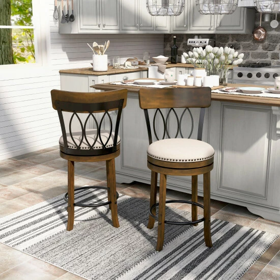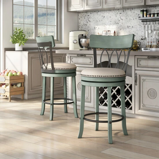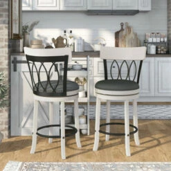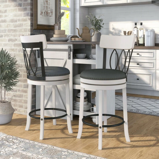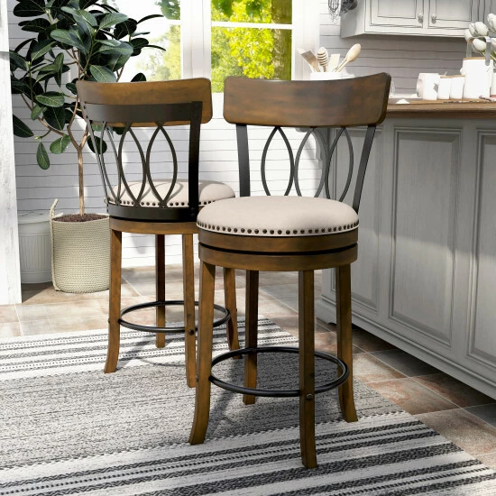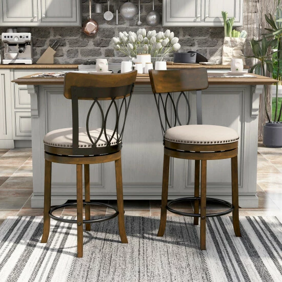 A contemporary home will find value in this set of bar chairs. The 360° swivel round seat is convenient when hosting parties as it allows for effortless conversation around the kitchen bar. Black metal accents decorate the curved backrest and offer a footrest for comfort. The 100% foam-filled fabric seat is adorned with nailhead trim for added style.