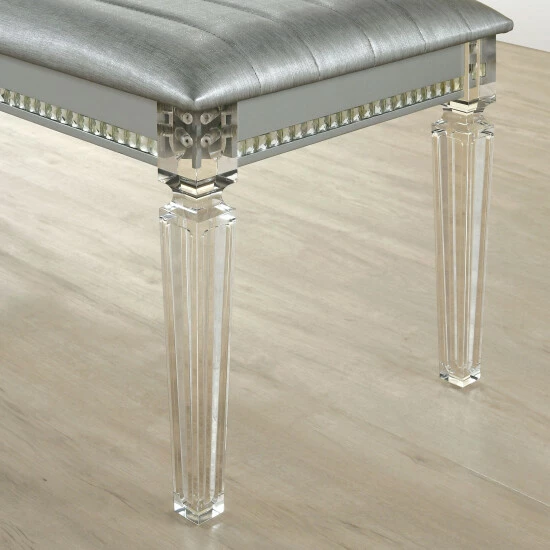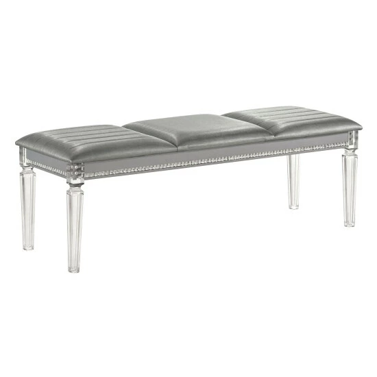 Channel tufted faux leather shimmers on the seat of this modern glam accent bench. Crystal and mirror trim sparkles beautifully in the light while acrylic legs provide airy support. A silver finish ensures a glamorous addition to your bedroom.