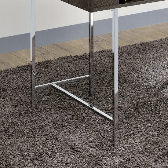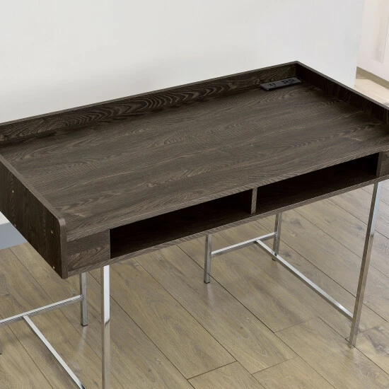 Get down to business and get work done with efficiency when you add this transitional computer desk to your home or office. Made by Furniture of America for the Yary collection, this sleek desk features a chrome metal frame and brown desktop accented by wood grain details. For organization, this desk comes with two convenient open compartments below the desktop. The open design gives this piece an open and airy feel for the office, equipped with a supportive geometric base for stunning style. Find two convenient USB and power outlets for computers, smart devices, and lamps to support the modern-day student or entrepreneur.