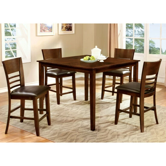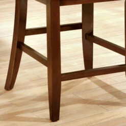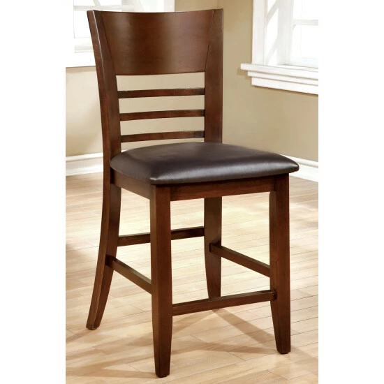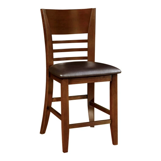 This set of two versatile counter-height chairs will add a warm element to your home. It features a solid wood brown cherry frame and legs along with a thick faux leather seat for comfort. The curved back features an airy, horizontal slatted design for a more casual feel. Solid legs that taper in front and flare in back add the final touch to chairs that are suitable for a breakfast counter or a home bar area.