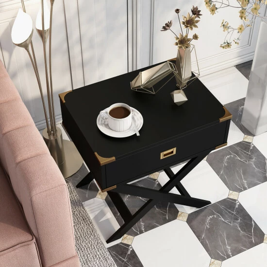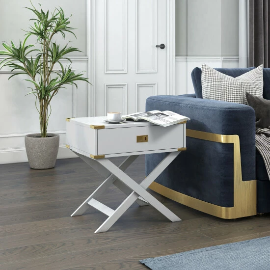 The Yore side table offers a glam accent to your living room or bedroom decor. Made with wood veneer in glossy black or white with goldtone metal accents, this side table has graceful, upscale aesthetic. The single drawer is lined with felt, making it great for storing jewelry and other fragile items.