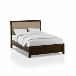 Crisp lines and a solid silhouette make up the classic design of this transitional style panel bed. Crafted by Furniture of America for the Yra collection, this piece brings both style and function to the bedroom. Featuring a rich walnut finish, this bed is enhanced with a slight curved headboard. The headboard is made with a beige linen-like upholstery, filled with foam for incredible comfort. Tapered legs bring stability to this piece while its frame is crafted from wood for incredible quality. Overall, this Furniture of America panel bed conveys sophistication and convenience that make it an ideal choice for any bedroom.