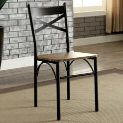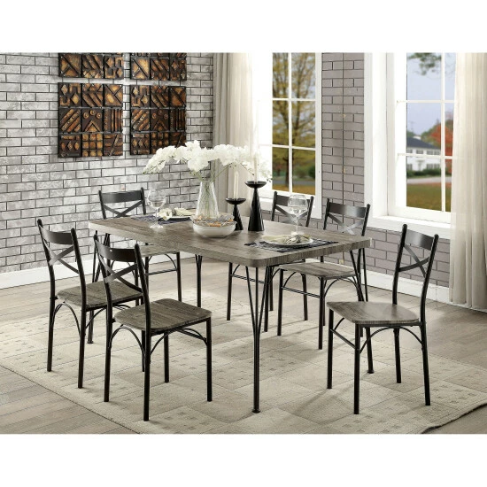 Elevate your dining room decor with Furniture of America’s Zath Industrial Bronze Metal 7-piece Dining Set. The collection delivers on a stylish industrial aesthetic with a mix of metal and wood that creates a rugged look and feel with inviting personality. Six charming side chairs feature metal frames and X-style backs to further deliver an industrial-inspired look. Arched supports underneath wood finish seats add just a hint of feminine softness. The matching table offers ample space for serving family-style meals while the set maintains a compact profile that works well in an eat-in kitchen or breakfast nook. Wood accents in light tones give this dining set a hint of weathered, vintage style.