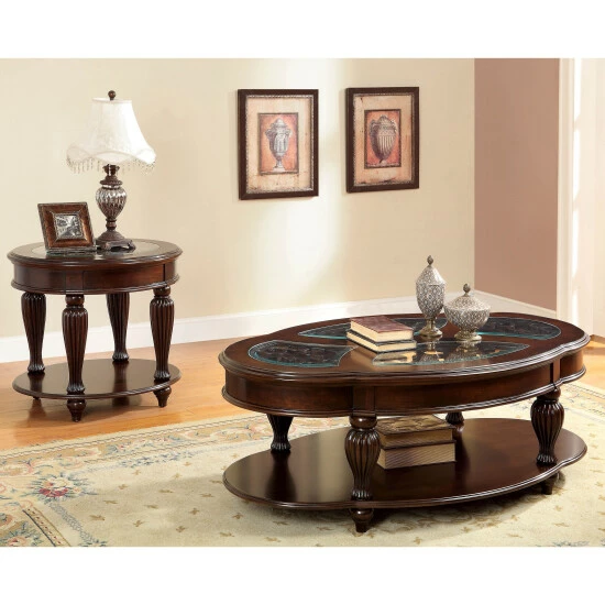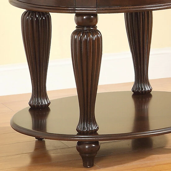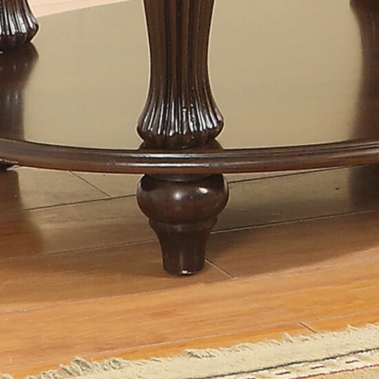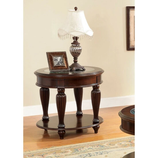 Traditional elegance transforms the vibe of a semi-formal or formal living space, creating a perfect venue for the Zerathe transitional cherry accent end table. This table from Furniture of America highlights a careful approach to artisan design, paying attention to small details. Wood construction with a cherry finish includes veneer accents, offering a sturdy look and feel. Its round tabletop features a gleaming pane of tempered glass. A thick apron offers linear accenting, as the luscious frame design showcases reeded, curved legs. Two surfaces include a spacious tabletop and lower shelf, each making space for storage and display.