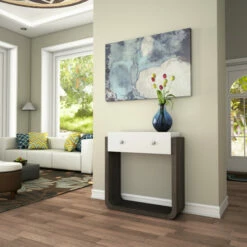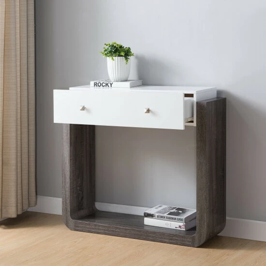 Restyle your casual space with this sofa console table by Furniture of America. A fitted single drawer with stylish geometric designs keeps small essentials within easy reach, perfect for keys or mail when used in a front entryway, or magazines and remotes when used in your living room. The curved base of this piece from the Zilo collection delivers a sleek, streamlined appearance while providing space for storage or any type of decorative items. The combination of glossy white and distressed grey finishes elevates your room’s color palette, while blending seamlessly in with your existing decor palette. This collection also offers a TV stand, buffet and coffee table, available separately.