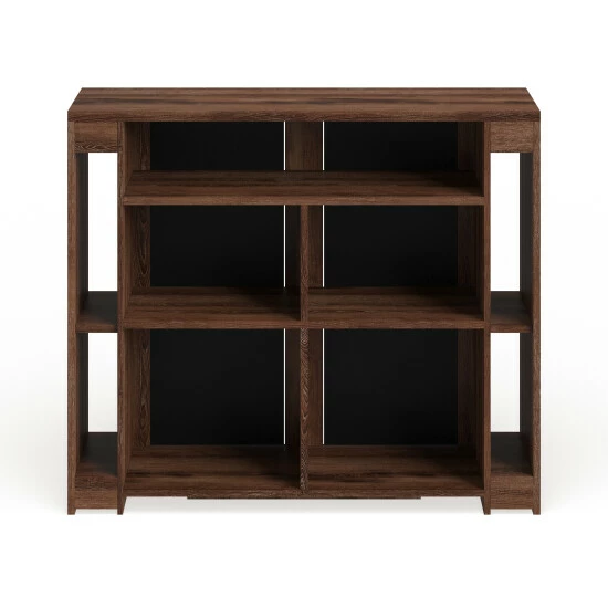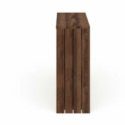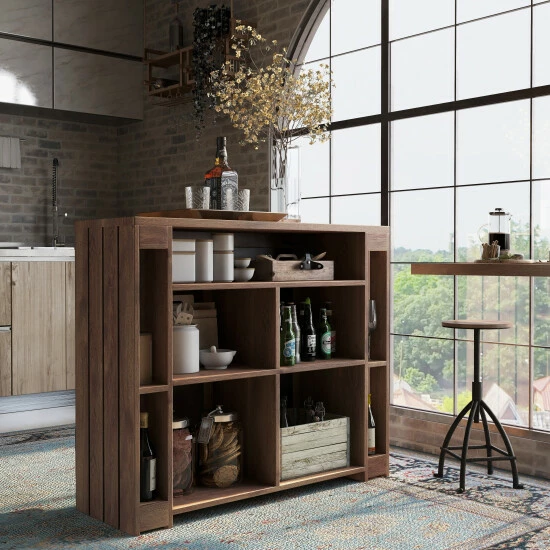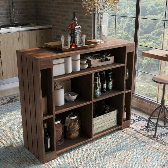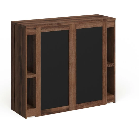 Impress your guests with this charming farmhouse bar table. Whether serving cocktails or sharing a drink, it’s an eye-catching addition sure to spark conversation. The table delivers ample open shelving that easily holds favorite spirits, glassware, and bar essentials. Adding a creative touch to the table, chalkboard panels allow you to write out drinks or fun messages. Delivering on its casual, fun look and feel, the table features vertical slats that evoke classic farmer’s market wooden crates. The table is complete with a versatile walnut wood finish that enhances and defines its rustic design. This elevated bar table includes a cutting board for easy drink-making.