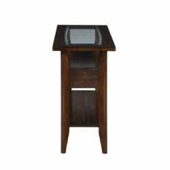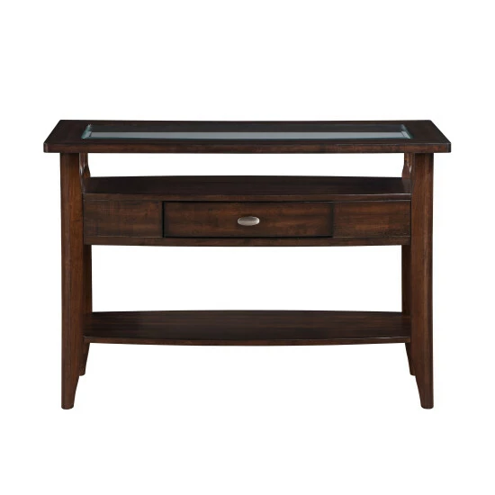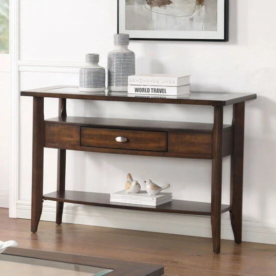 Bring elements of mother nature into your home with this charming traditional walnut finish sofa table. A glass inset tabletop adds sophistication while the lower shelf and drawer create an easy place for storage and display.