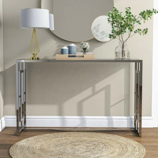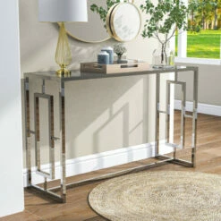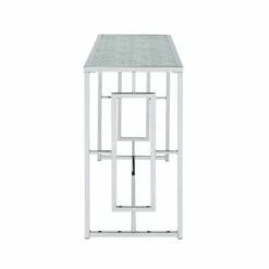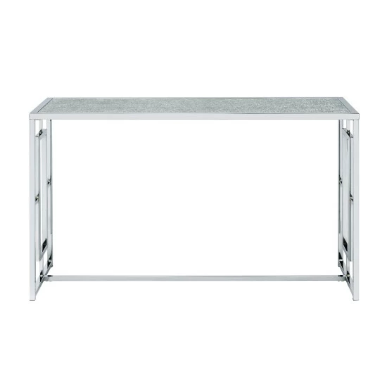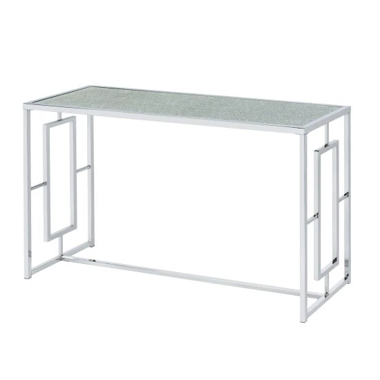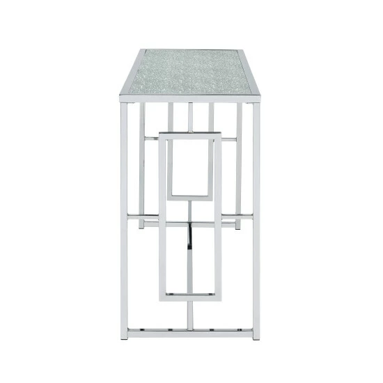 Introduce an elegant touch to your entryway with this chic chrome sofa table. Its geometric base delivers a custom appearance with the decorative waterfall glass tabletop, creating a compelling visual contrast and texture.