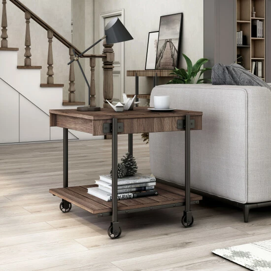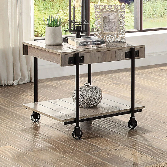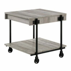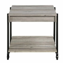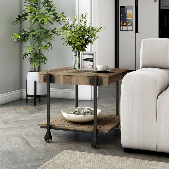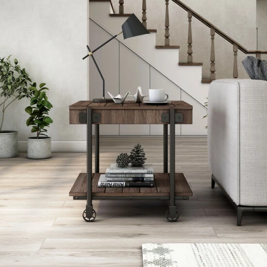 Charming details bring out the farmhouse character of this rustic wood finish side table. Perfect for a welcoming family living room, it delivers plank style accent, a lower shelf for display, and black finished legs.