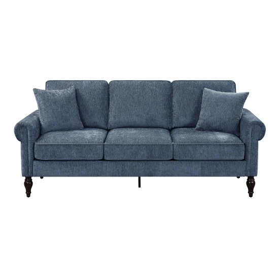 Design your welcoming family space around the familiar warmth of this traditional three-seat sofa. Soft chenille upholstery pairs with plush cushions and pillows while rolled arms and turned legs boost the classic ambiance of this inviting sofa.