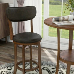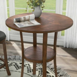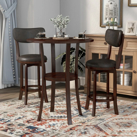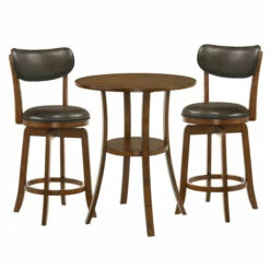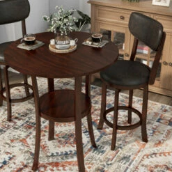 Whether grabbing a quick bite to eat or catching with a friend over drinks, you’ll appreciate the welcoming nature of this three-piece round counter height dining set. Plush chairs include swivel seats while a lovely okume wood veneer tabletop provides a classic touch. Flared legs host a round shelf, perfect for a hint of personal style.