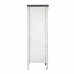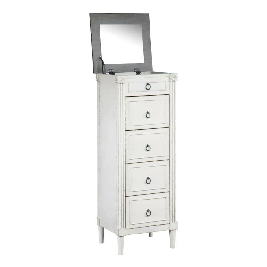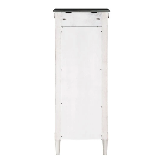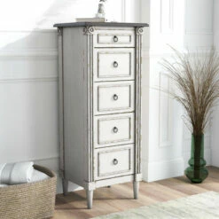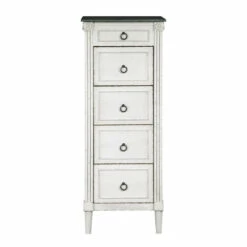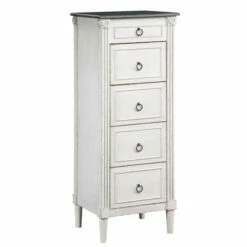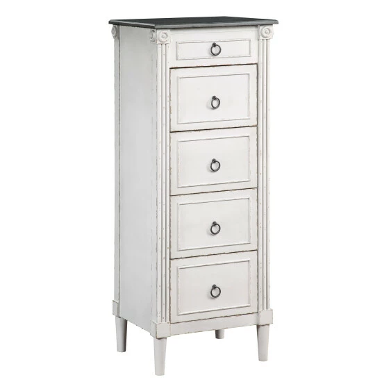 Perfect for a bedroom or entry hall, this charming traditional tall dresser adds an easy place for organization. Stacked drawers are accented with ring hardware while an antique white finish allows for an aged, authentic look that brings a vintage flair to any room.