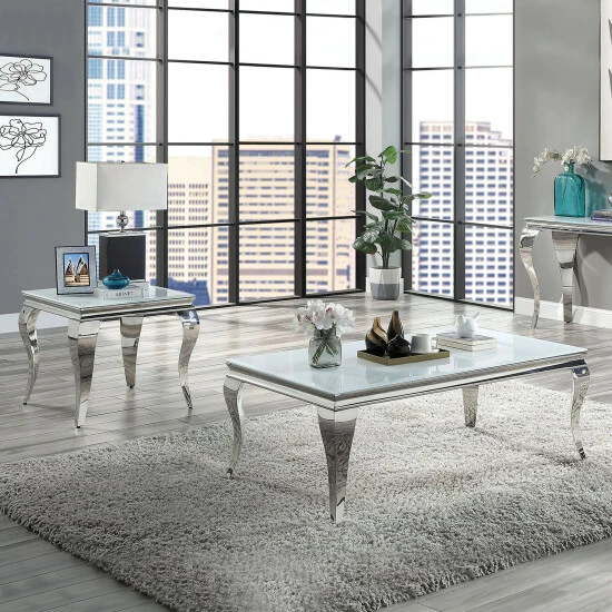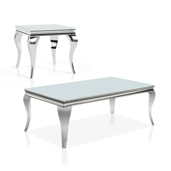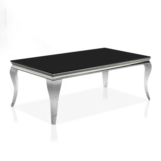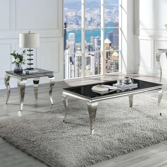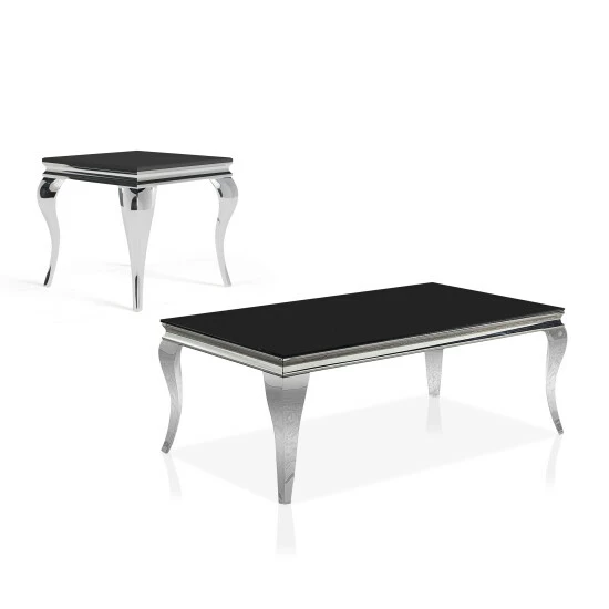 Embrace timeless curves blended with ultra-modern style in this contemporary two-piece coffee table set. Cabriole legs add a hint of drama to tempered black glass tops and a gleaming silver finish that adds reflectivity and sophistication to any sitting area.