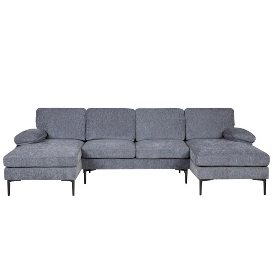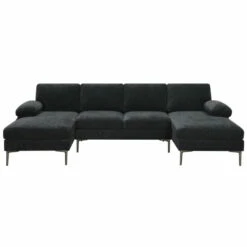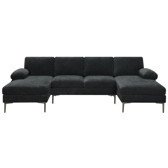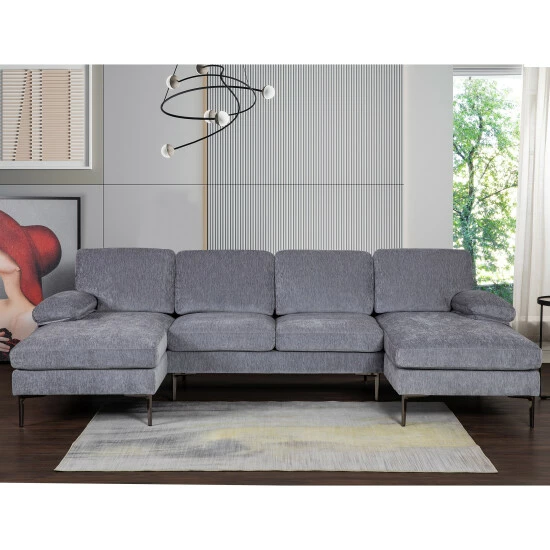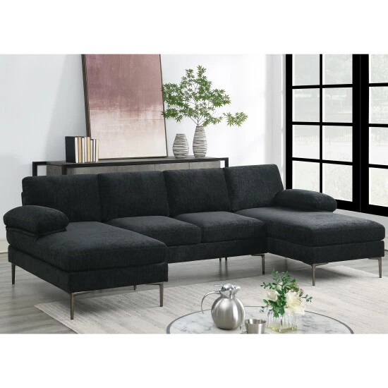 Dive into the plush comfort and inviting softness of this contemporary U-shaped sectional with a care kit. Beautifully soft fabric pairs with a spacious double chaise design while smoke finish plated steel legs provide optimal support and durability. Versatile enough for lounging with the family or impressing friends when entertaining.