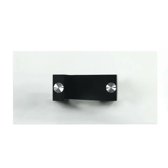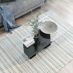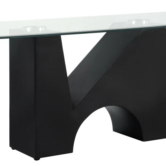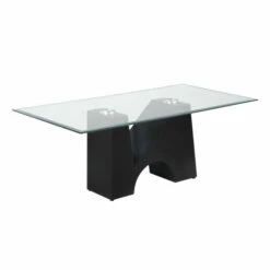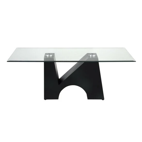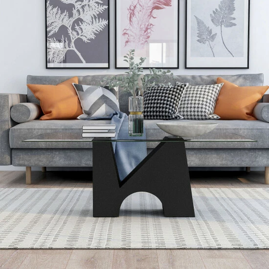 Marrying elements of minimalism and sculptural boldness, this modern coffee table is a dramatic centerpiece in your living room. The glass tabletop is beveled and sits on a bold, black finish base that pairs a graceful arch and crisp triangular cutout for a striking effect.