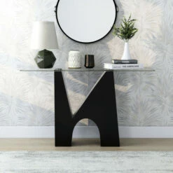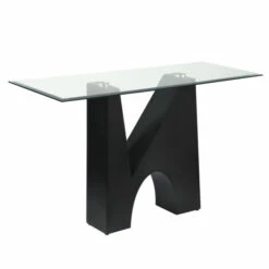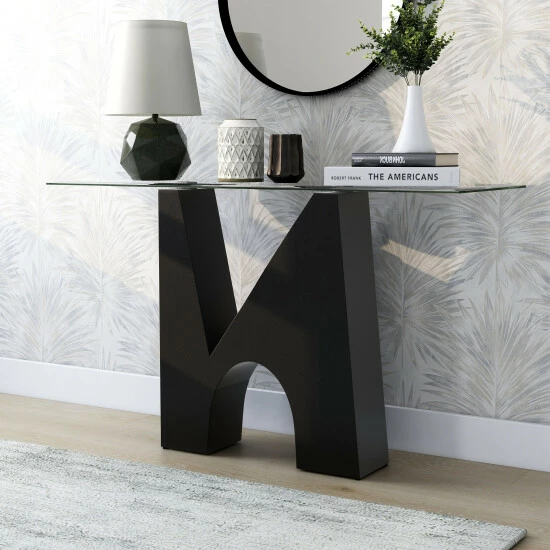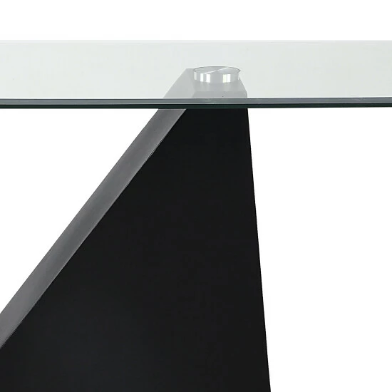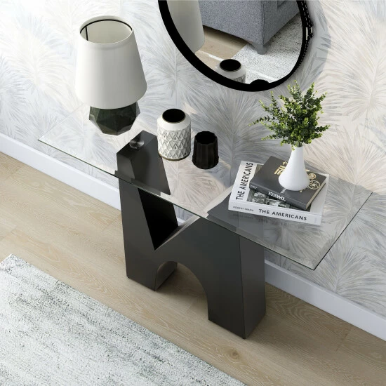 Marrying elements of minimalism and sculptural boldness, this modern coffee table is a dramatic centerpiece in your living room. A glass tabletop is beveled and sits atop a bold, black finish base that pairs a graceful arch and crisp triangular cutout for a striking effect.