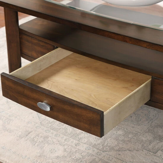 This versatile and transitional coffee table offers a rich dark walnut finish wood frame with slender legs fitted with caster wheels for easy mobility. A clear tempered glass top insert with a beveled edge offers an airy look and reveals decor on the open shelf designed with a convenient drawer.