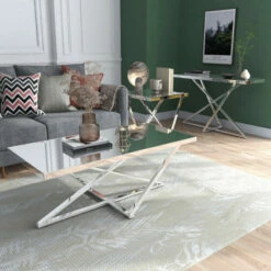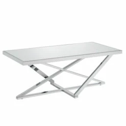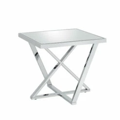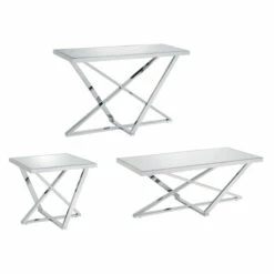 An eye-catching centerpiece for a sophisticated, modern living room, this three-piece chrome table set is a magnificent addition. Chrome finish glistens in the light while mirrored tabletops add a light, airy ambiance. The design is grounded in its geometric base design.